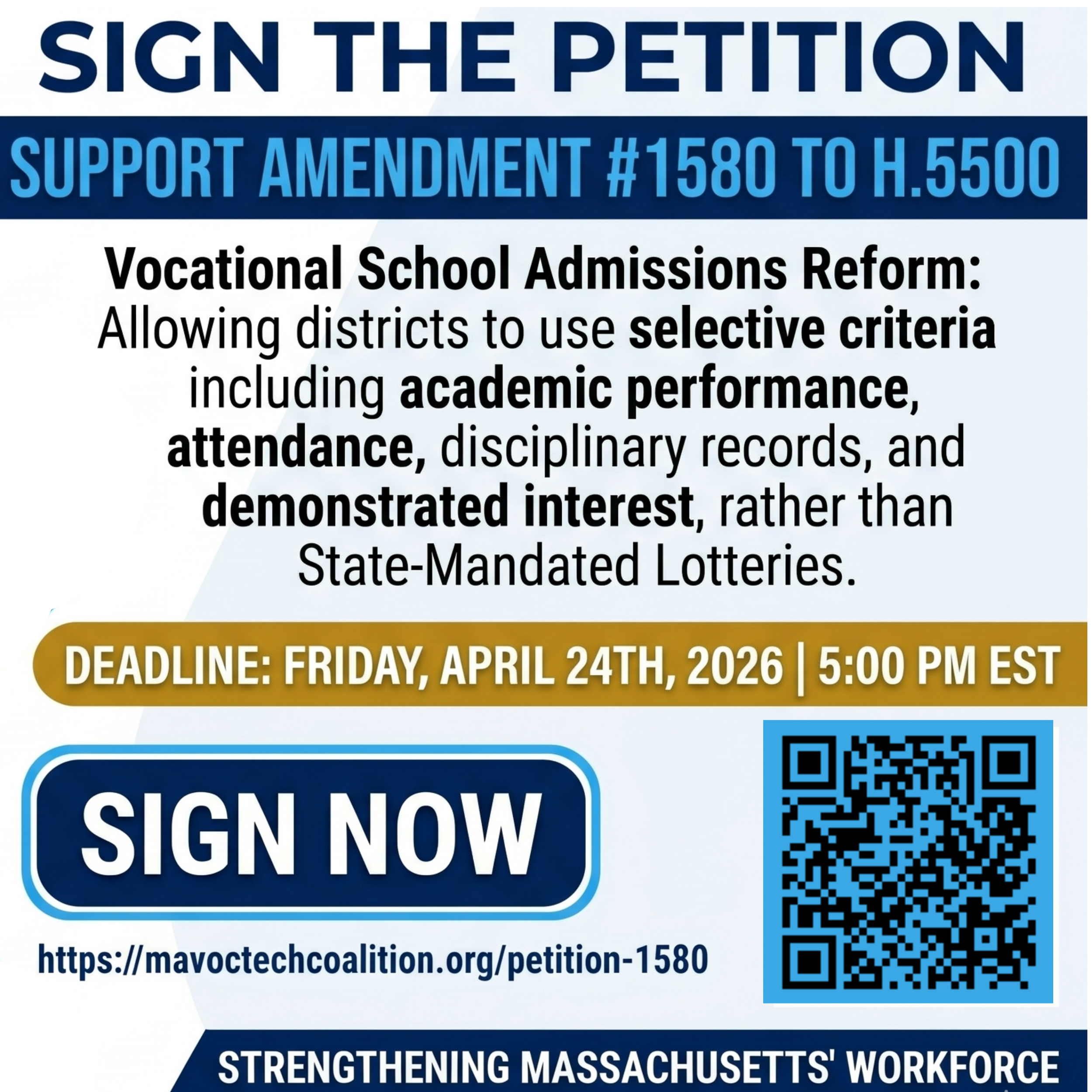 We, the undersigned, support Amendment #1580: Vocational School Admissions Reform and urge the House to favorably pass this amendment to H5500. This amendment is critical to protecting the integrity of the Commonwealth’s vocational-technical and agricultural schools—the "gold standard" of our public education system.